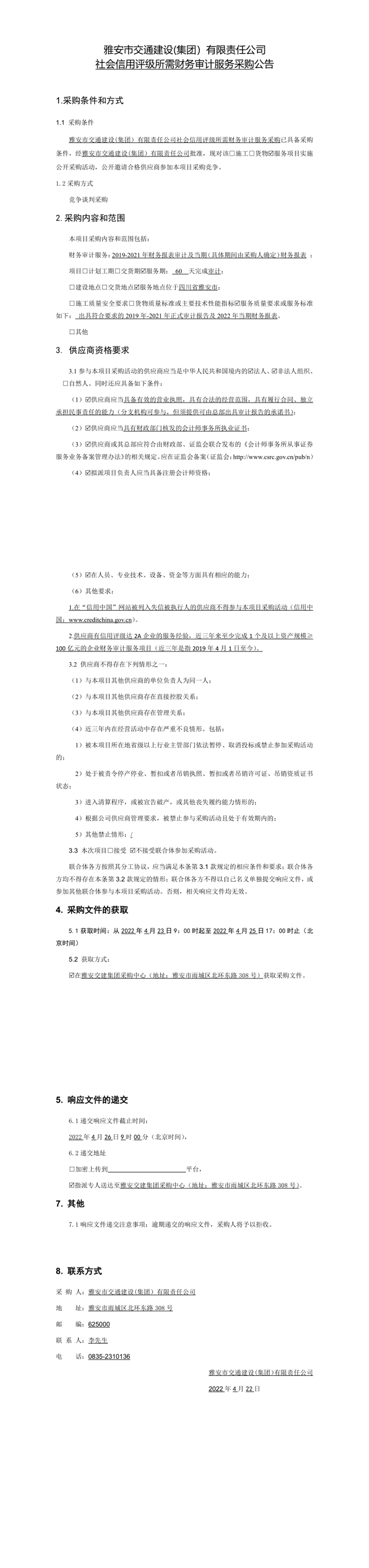 雅安市交通建設(shè)(集團(tuán))有限責(zé)任公司社會(huì)信用評(píng)級(jí)所需財(cái)務(wù)審計(jì)服務(wù)采購公告