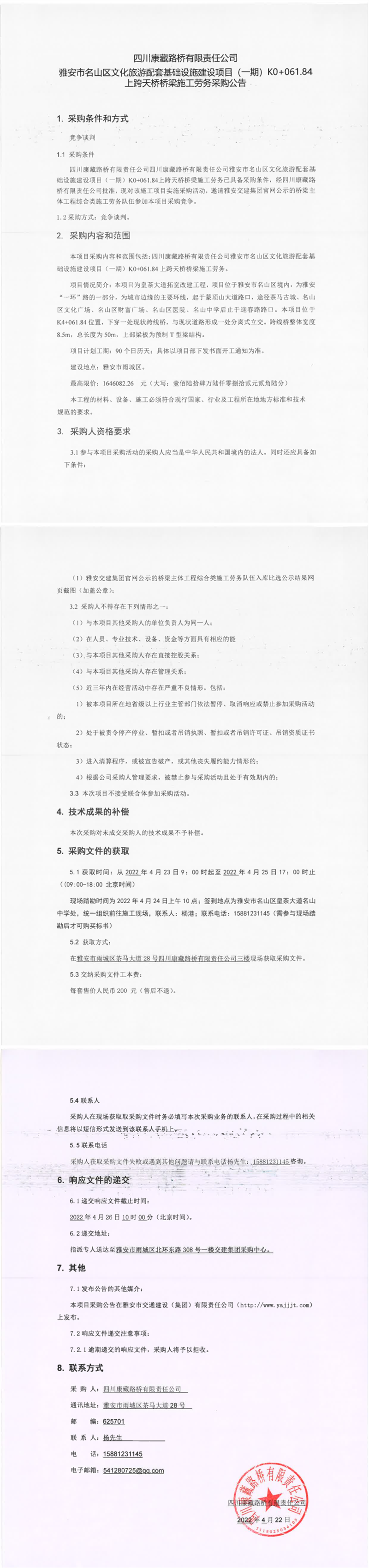 四川康藏路橋有限責(zé)任公司G318天全項(xiàng)目清水灣鋼管樁施工勞務(wù)采購競價公告