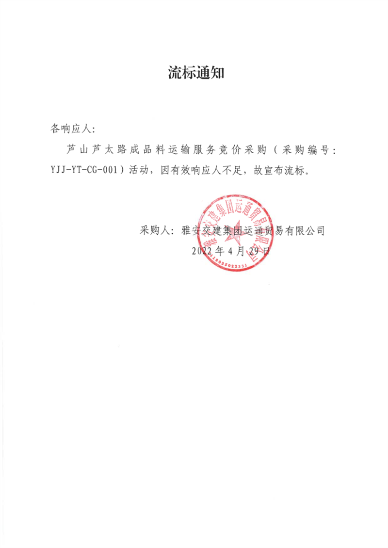 雅安交建集團(tuán)運(yùn)通貿(mào)易有限公司蘆山蘆太路成品料運(yùn)輸服務(wù)競(jìng)價(jià)采購(gòu)流標(biāo)通知