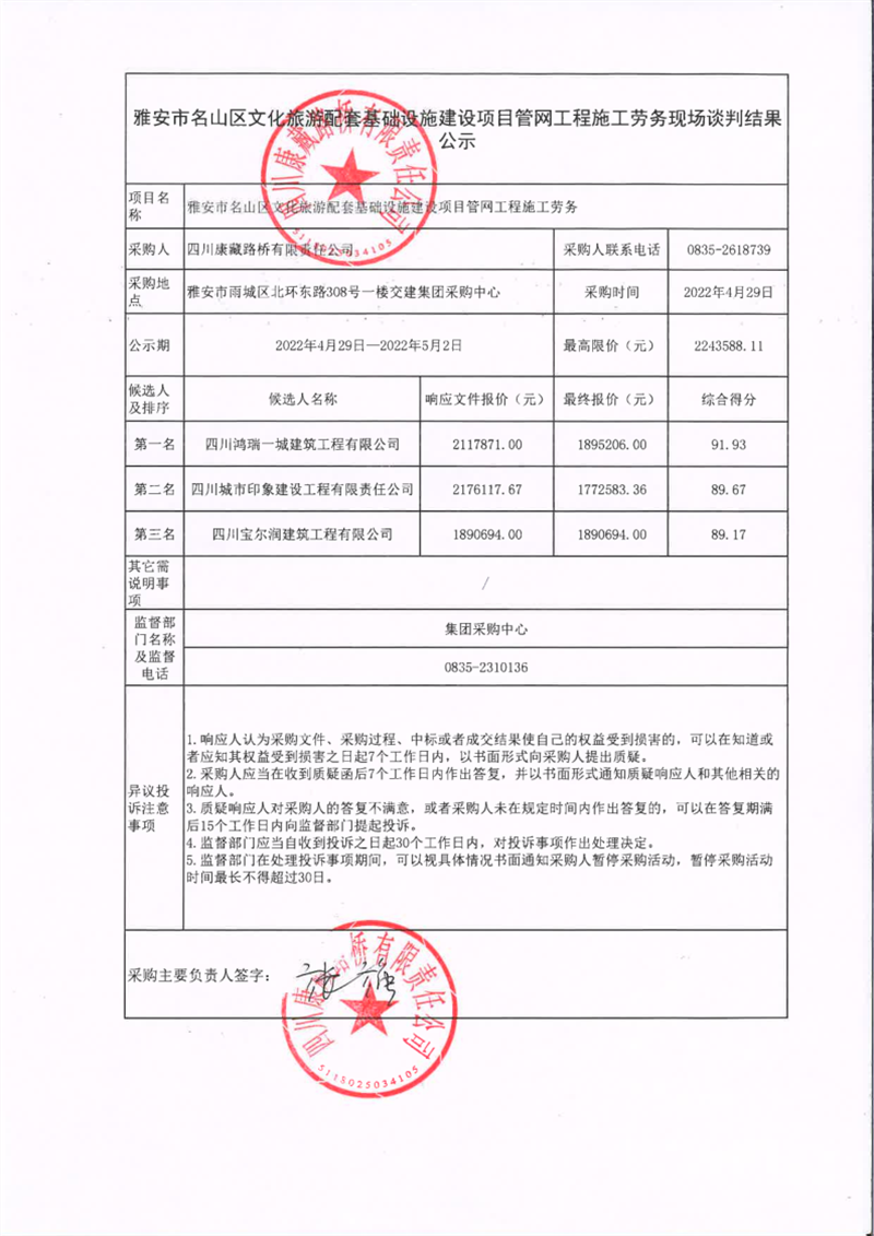 四川康藏路橋有限責(zé)任公司雅安市名山區(qū)文化旅游配套基礎(chǔ)設(shè)施建設(shè)項目管網(wǎng)工程施工勞務(wù)現(xiàn)場談判結(jié)果公示