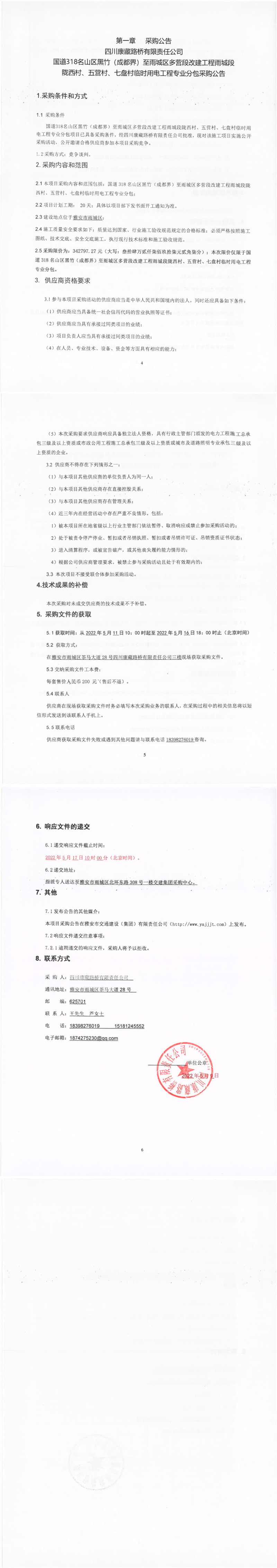 四川康藏路橋有限責(zé)任公司國(guó)道318名山區(qū)黑竹(成都界)至雨城區(qū)多營(yíng)段改建工程雨城段隴西材、五營(yíng)村、七盤(pán)村臨時(shí)用電工程專(zhuān)業(yè)分包采購(gòu)公告
