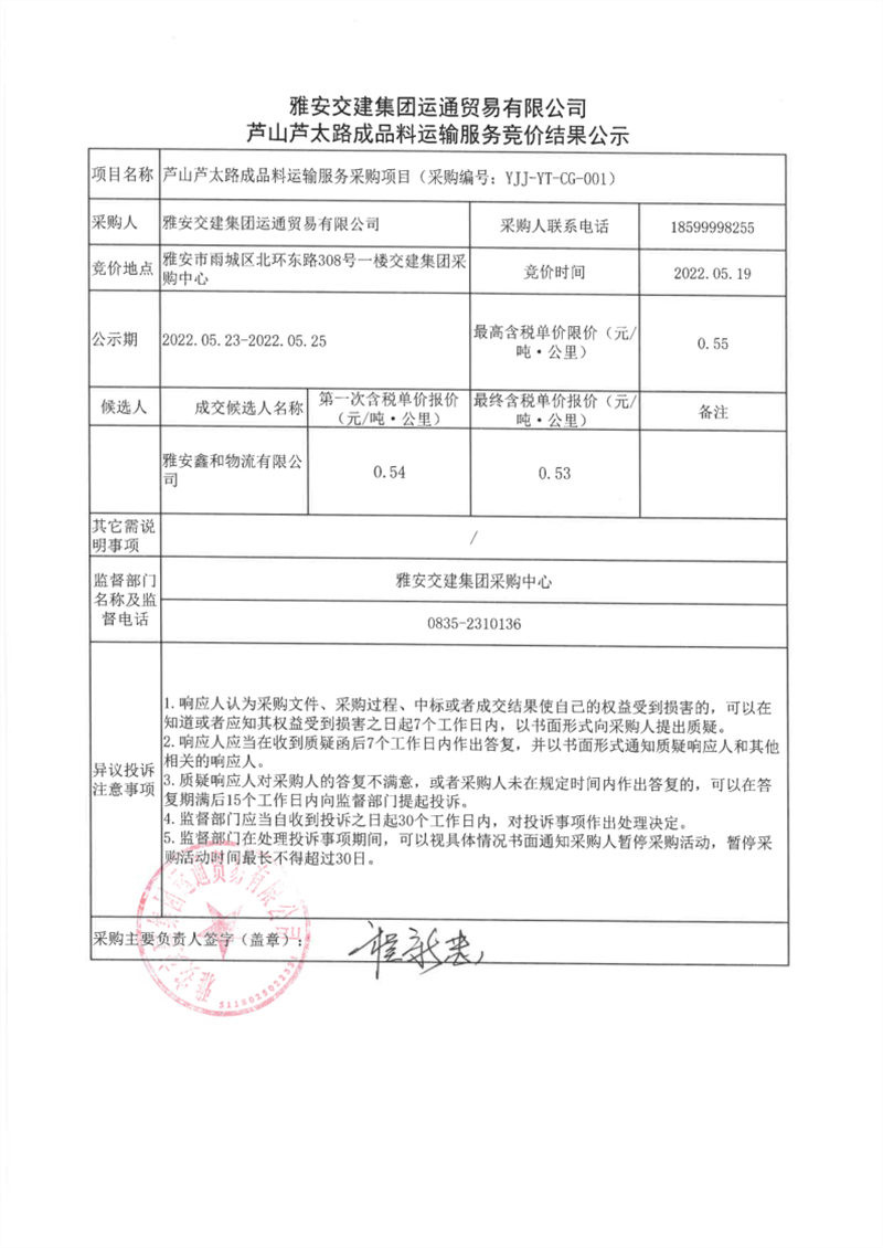 雅安交建集團(tuán)運(yùn)通貿(mào)易有限公司蘆山蘆太路成品料運(yùn)輸服務(wù)競價(jià)結(jié)果公示