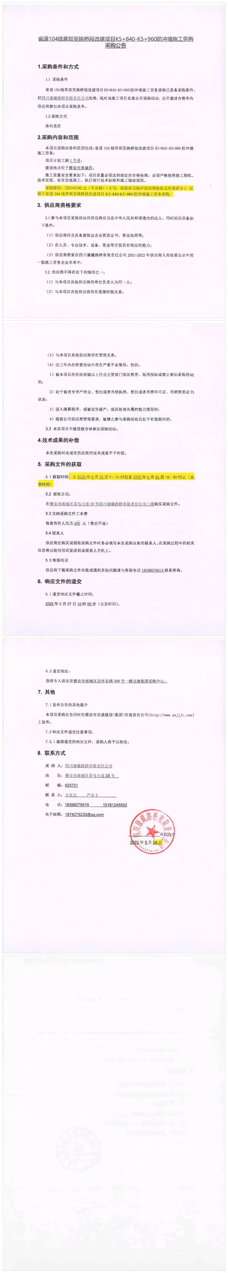 四川康藏路橋有限責任公司省道104線草壩至姚橋段改建項目K5+840-K5+960防沖墻施工勞務(wù)采購公告
