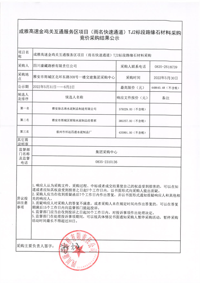 四川康藏路橋有限責任公司成雅高速金雞關互通服務區(qū)項目(雨名快速通道)TJ2標段路緣石材料采購競價采購結(jié)果公示