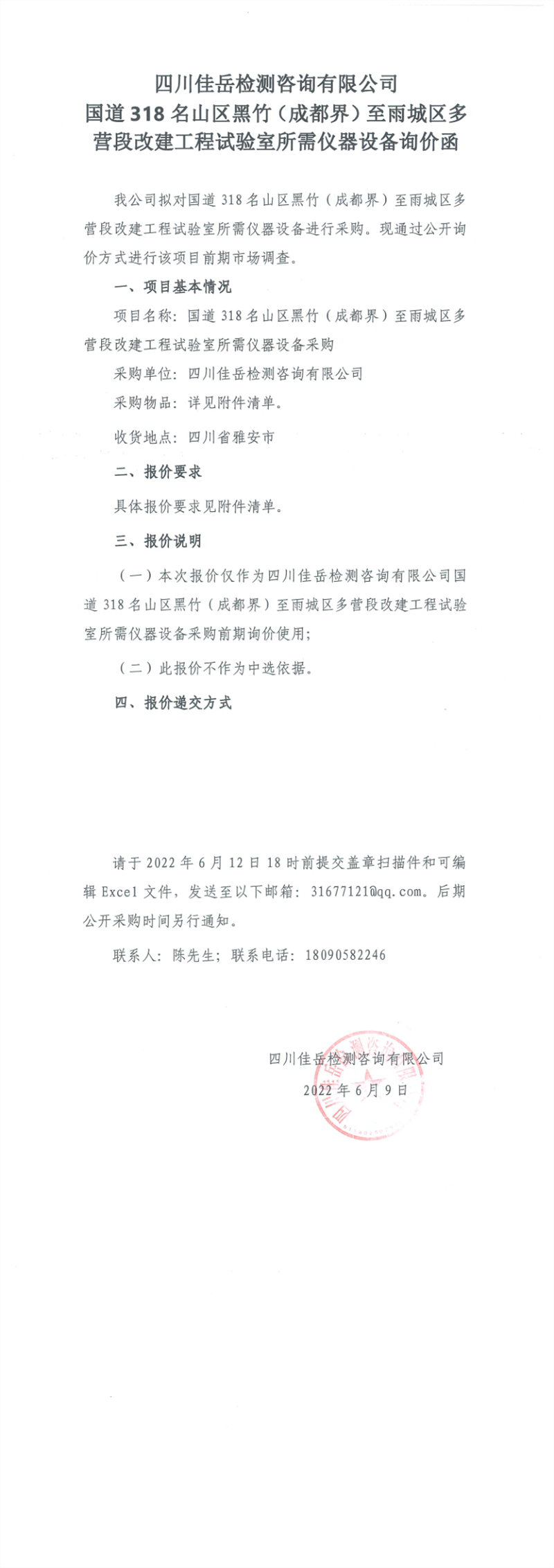 四川佳岳檢測咨詢有限公司國道318名山區(qū)黑竹(成都界)至雨城區(qū)多營段改建工程試驗室所需儀器設(shè)備詢價函
