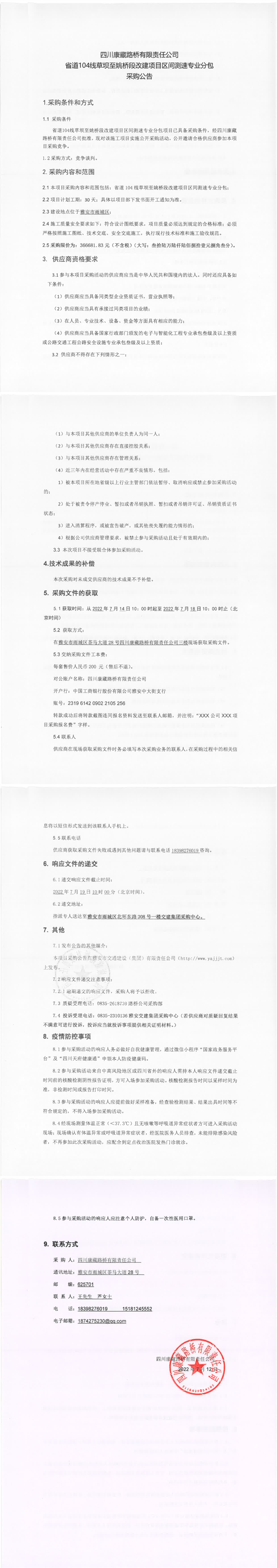 四川康藏路橋有限責(zé)任公司省道104線草壩至姚橋段改建項(xiàng)目區(qū)間測(cè)速專業(yè)分包采購(gòu)公告