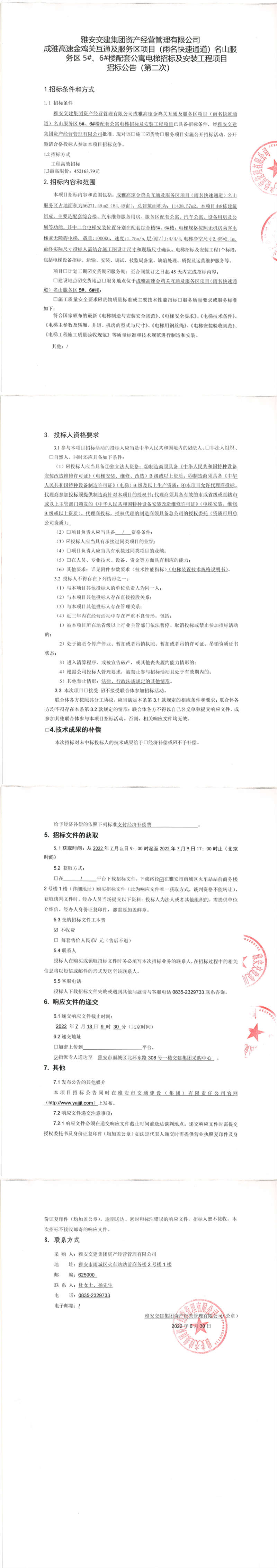 雅安交建集團資產(chǎn)經(jīng)營管理有限公司成雅高速金雞關(guān)互通及服務(wù)區(qū)項目(雨名快速通道)名山服務(wù)區(qū)5#、6#樓配套公寓電梯招標及安裝工程項目招標公告(第二次)