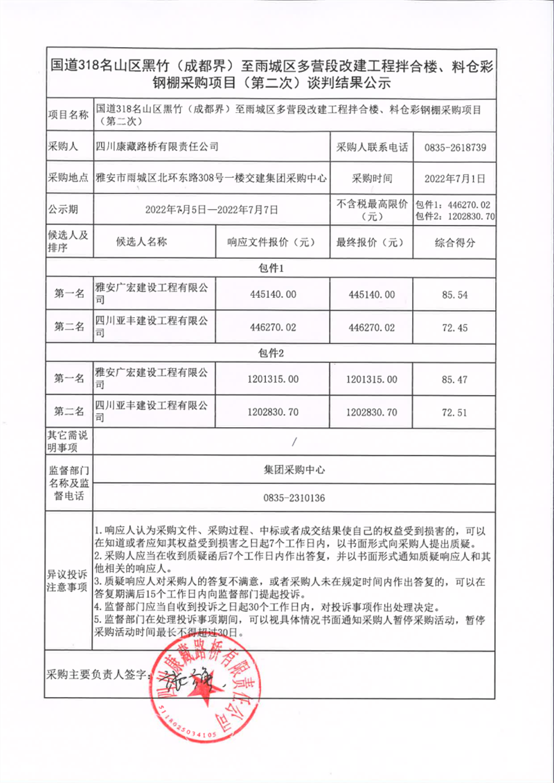 四川康藏路橋有限責任公司國道318名山區(qū)黑竹(成都界)至雨城區(qū)多營段改建工程拌合樓、料倉彩鋼棚采購項目(第二次)談判結果公示