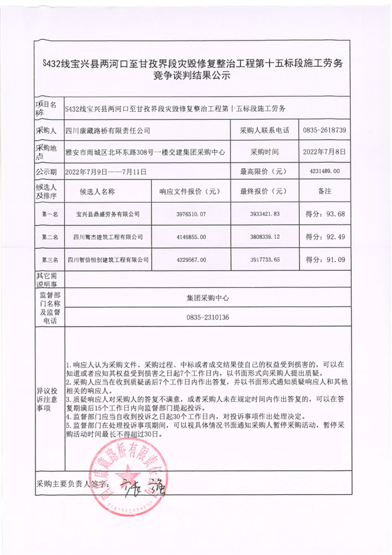 四川康藏路橋有限責(zé)任公司S432線寶興縣兩河口至甘孜界段災(zāi)毀修復(fù)整治工程第十五標(biāo)段施工勞務(wù)競爭談判結(jié)果公示