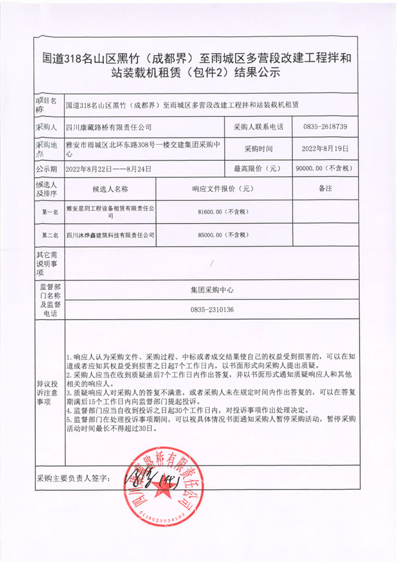 四川康藏路橋有限責(zé)任公司國道318名山區(qū)黑竹(成都界)至雨城區(qū)多營段改建工程拌和站裝載機(jī)租賃(包件2)結(jié)果公示
