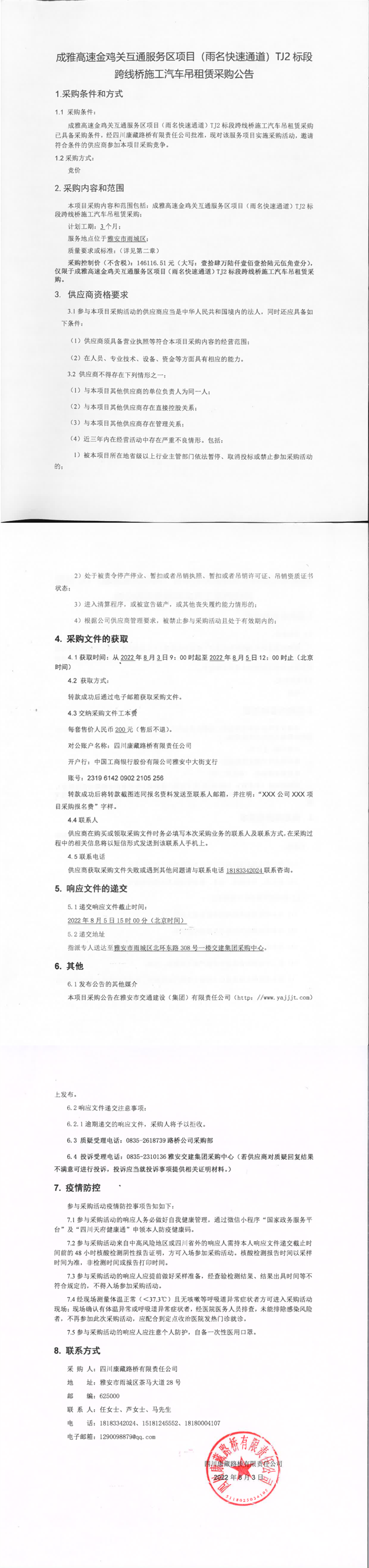 四川康藏路橋有限責任公司成雅高速金雞關(guān)互通服務區(qū)項目(雨名快速通道)TJ2標段跨線橋施工汽車吊租賃采購公告