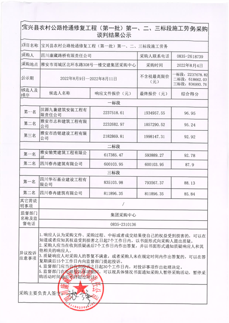 四川康藏路橋有限責任公司寶興縣農(nóng)材公路搶通修復工程(第一批)第一、二、三標段施工勞務(wù)談判結(jié)果公示