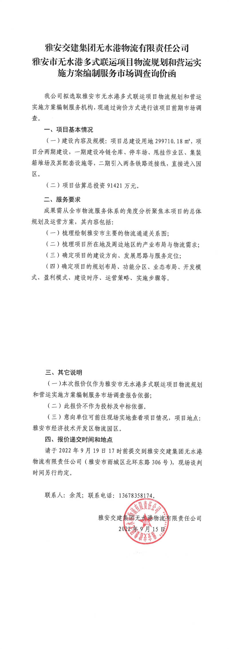 雅安交建集團無水港物流有限責(zé)任公司雅安市無水港多式聯(lián)運項目物流規(guī)劃和營運實施方案編制服務(wù)市場調(diào)查詢價函