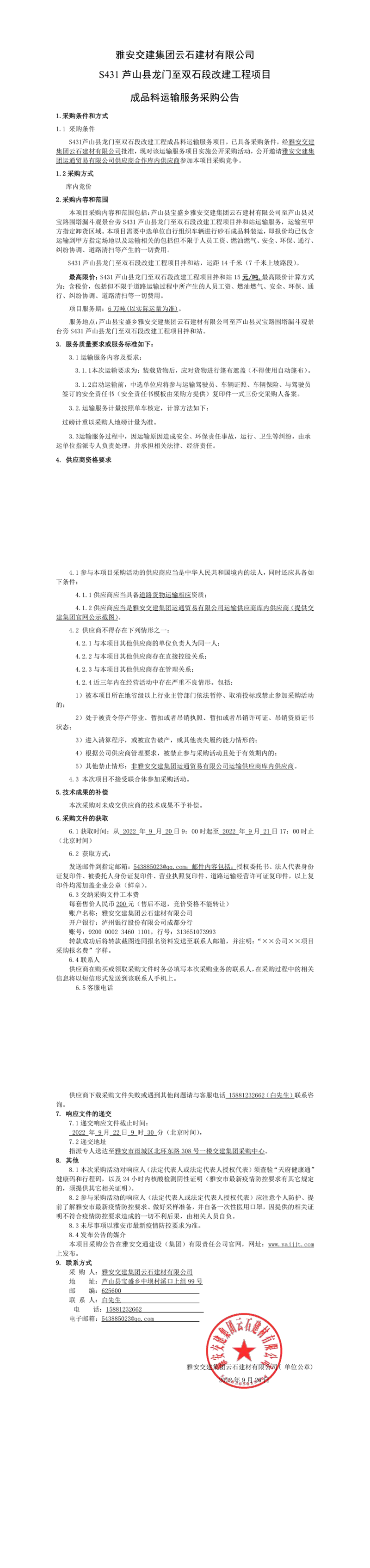 雅安交建集團(tuán)云石建材有限公司S431蘆山縣龍門至雙石段改建工程項(xiàng)目成品料運(yùn)輸服務(wù)采購公告