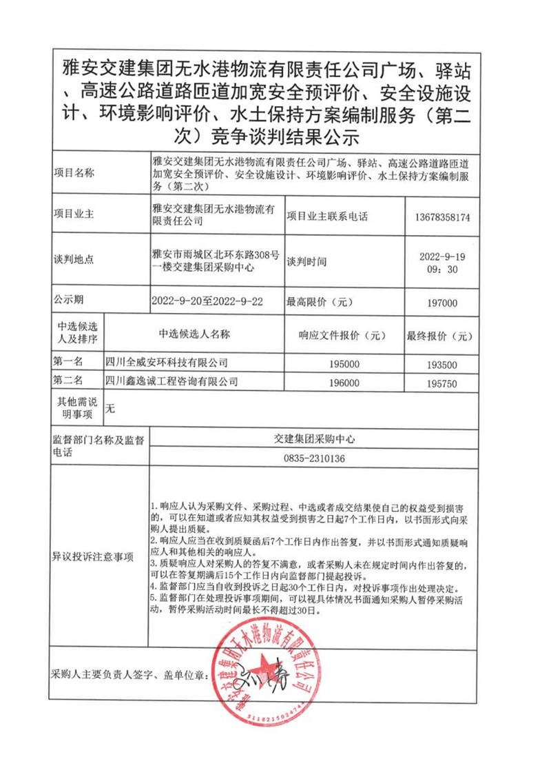雅安交建集團(tuán)無水港物流有限責(zé)任公司廣場(chǎng)、驛站、高速公路道路匝道加寬安全預(yù)評(píng)價(jià)、安全設(shè)施設(shè)計(jì)、環(huán)境影響評(píng)價(jià)、水土保持方案編制服務(wù)(第二次)競(jìng)爭(zhēng)談判結(jié)果公示