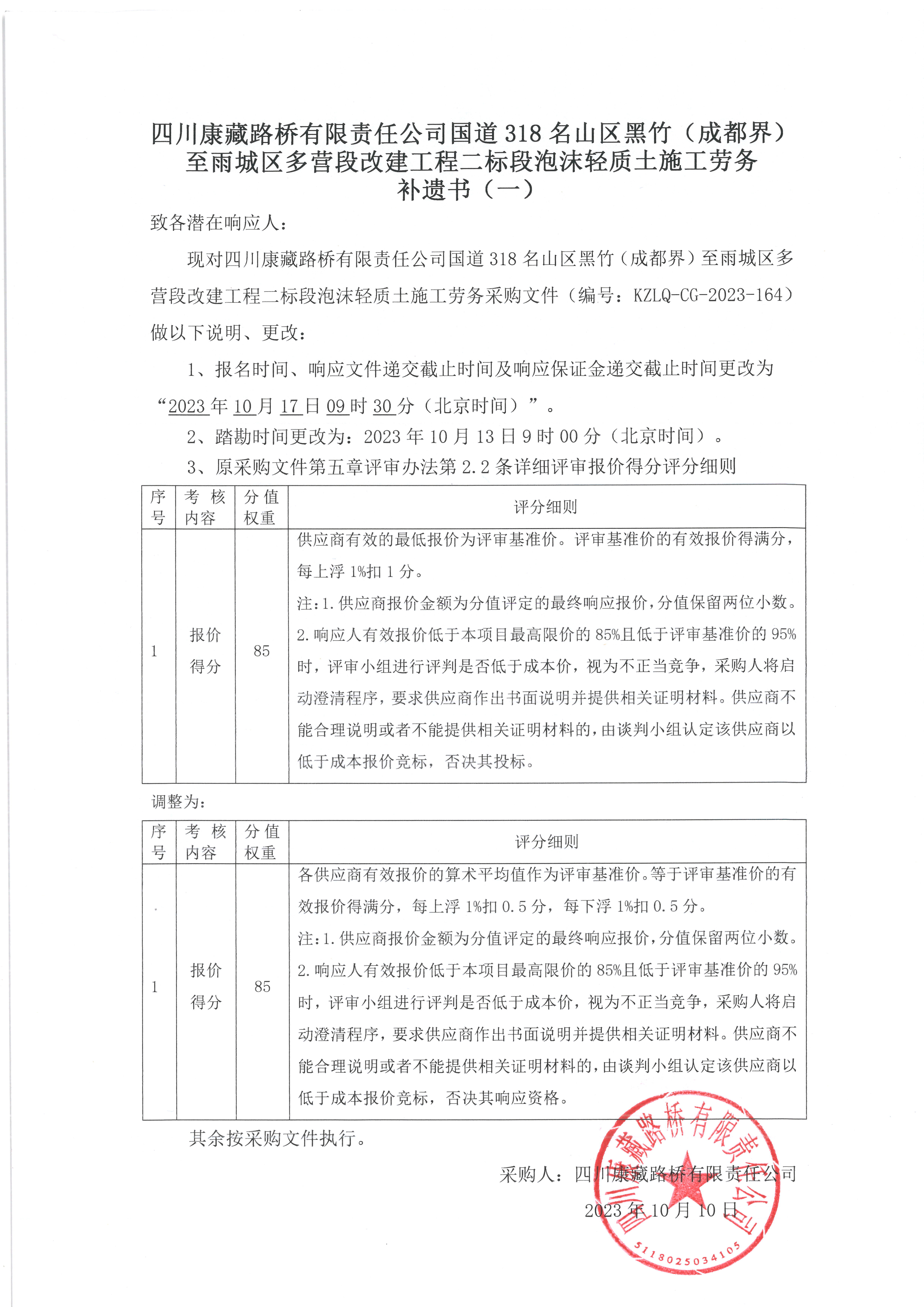 四川康藏路橋有限責(zé)任公司國道318名山區(qū)黑竹(成都界)至雨城區(qū)多營段改建工程二標(biāo)段泡沫輕質(zhì)土施工勞務(wù)補(bǔ)遺書(一)