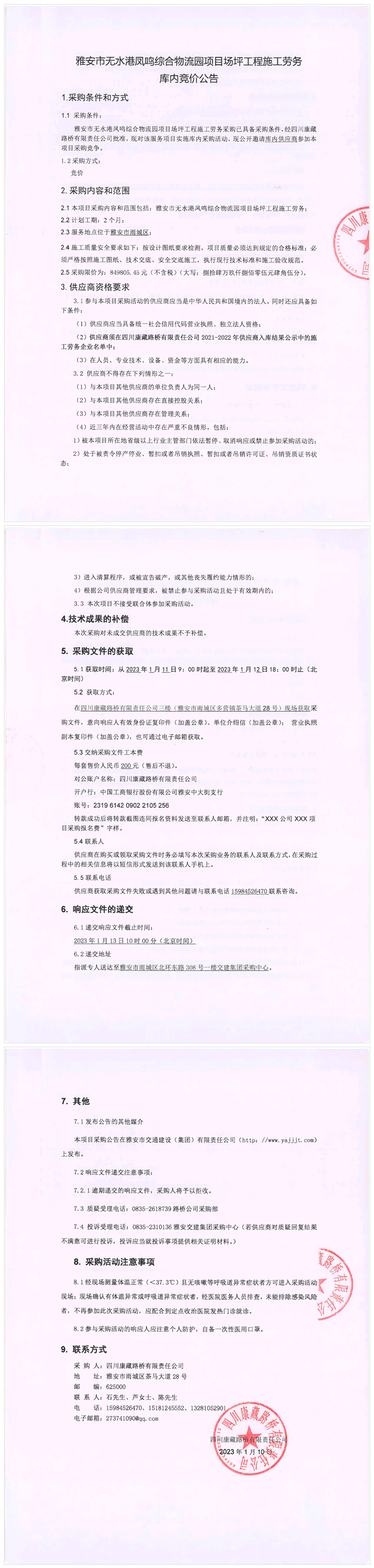 四川康藏路橋有限責(zé)任公司雅安市無水港鳳鳴綜合物流園項(xiàng)目場(chǎng)坪工程施工勞務(wù)庫(kù)內(nèi)競(jìng)價(jià)公告