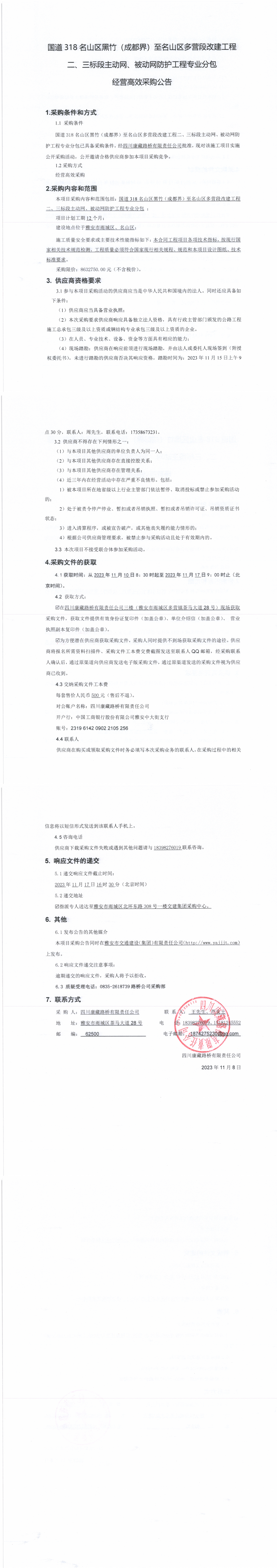 四川康藏路橋有限責任公司省道428雨城區(qū)周公山至堰場(洪雅界)段改建工程路基及臨建工程施工勞務競爭談判采購公告