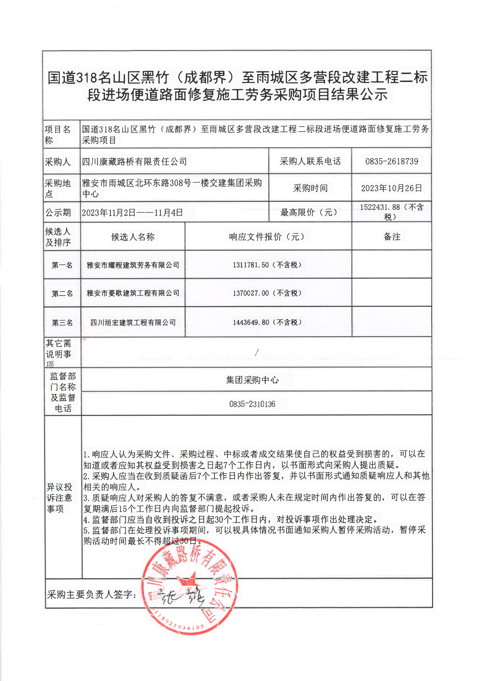 四川康藏路橋有限責(zé)任公司國道318名山區(qū)黑竹(成都界)至雨城區(qū)多營段改建工程二標(biāo)段進(jìn)場便道路面修復(fù)施工勞務(wù)采購項目結(jié)果公示
