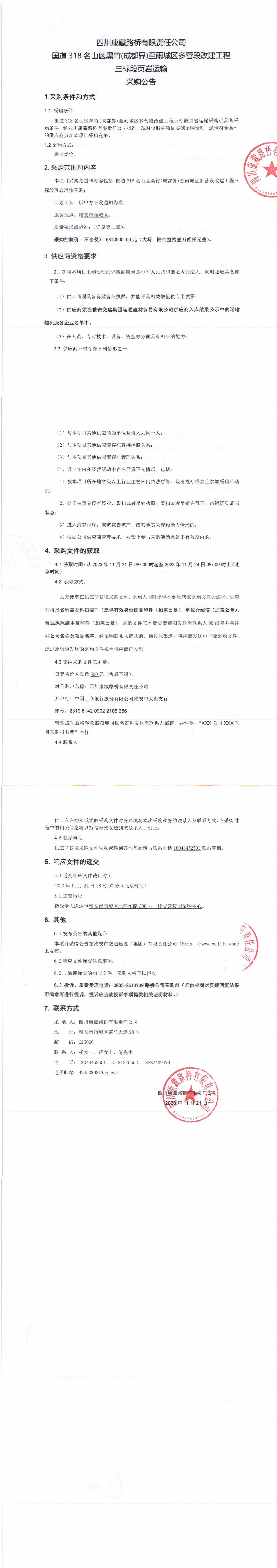 四川康藏路橋有限責(zé)任公司國道318名山區(qū)黑竹(成都界)至雨城區(qū)多營(yíng)段改建工程三標(biāo)段頁巖運(yùn)輸采購公告