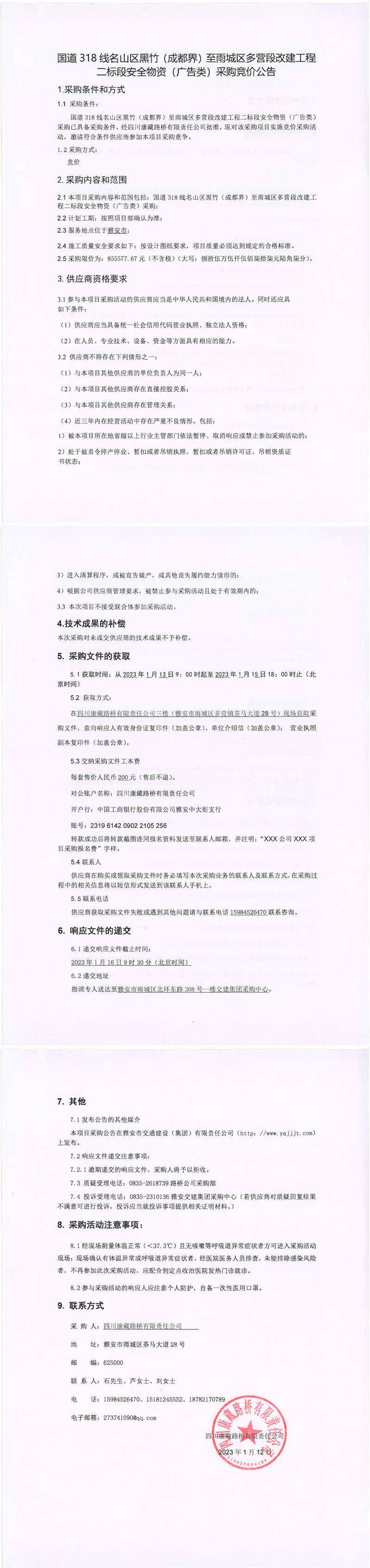 四川康藏路橋有限責(zé)任公司國道318線名山區(qū)黑竹(成都界)至雨城區(qū)多營段改建工程二標(biāo)段安全物資(廣告類)采購競(jìng)價(jià)公告