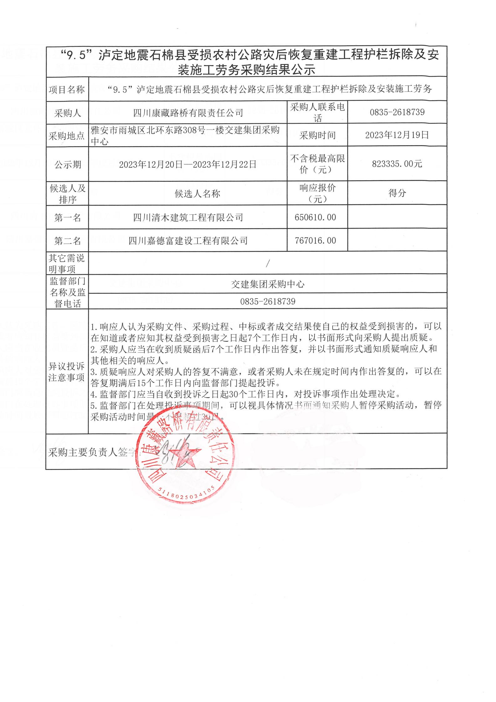四川康藏路橋有限責(zé)任公司“9.5”瀘定地震石棉縣受損農(nóng)村公路災(zāi)后恢復(fù)重建工程護(hù)欄拆除及安裝施工勞務(wù)采購結(jié)果公示
