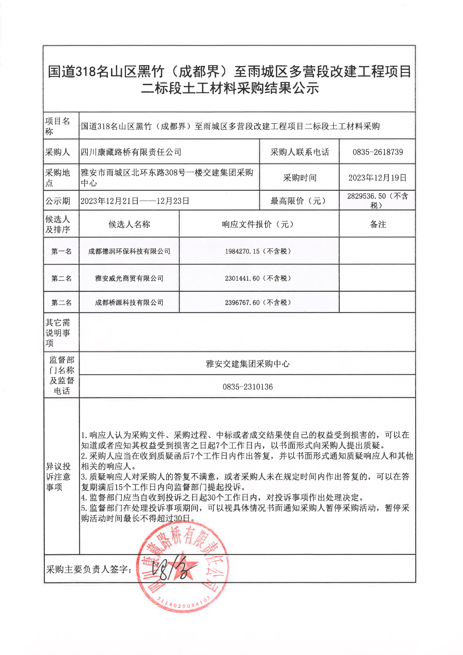 四川康藏路橋有限責(zé)任公司國道318名山區(qū)黑竹(成都界)至雨城區(qū)多營段改建工程項目二標(biāo)段土工材料采購結(jié)果公示