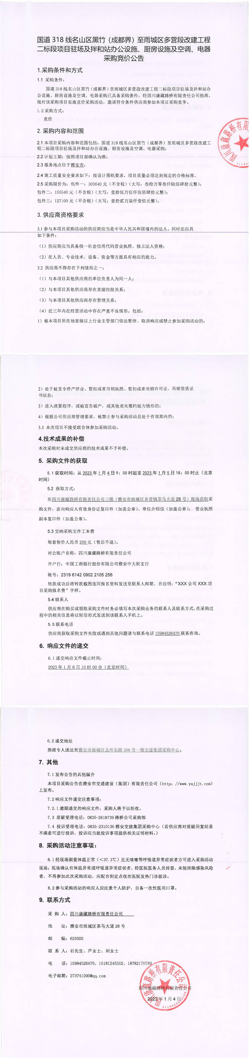 四川康藏路橋有限責任公司國道318線名山區(qū)黑竹(成都界)至雨城區(qū)多營段改建工程二標段項目駐場及拌和站辦公設施、廚房設施及空調、電器采購競價公告