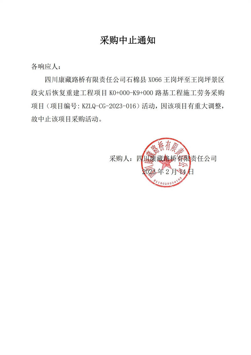 四川康藏路橋有限責(zé)任公司石棉縣X066王崗坪至王崗坪景區(qū)段災(zāi)后恢復(fù)重建工程項(xiàng)目K0+000-K9+000路基工程施工勞務(wù)采購中止公告