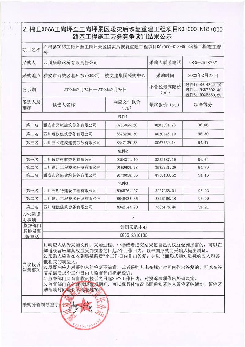 四川康藏路橋有限責(zé)任公司石棉縣X066王崗坪至王崗坪景區(qū)段災(zāi)后恢復(fù)重建工程項目土石方工程、排水工程、邊坡治理工程、防護工程施工勞務(wù)采購項目競爭談判結(jié)果公示