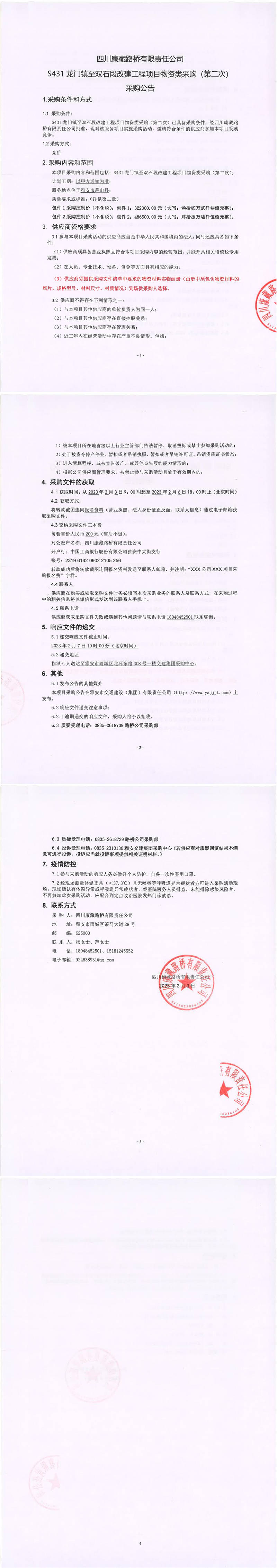 四川康藏路橋有限責(zé)任公司S431龍門(mén)鎮(zhèn)至雙石段改建工程項(xiàng)目物資類采購(gòu)(第二次)采購(gòu)公告