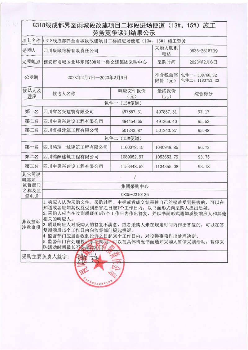四川康藏路橋有限責任公司G318線成都界至雨城段改建項目二標段進場便道(13#、15#)施工勞務競爭談判結(jié)果公示