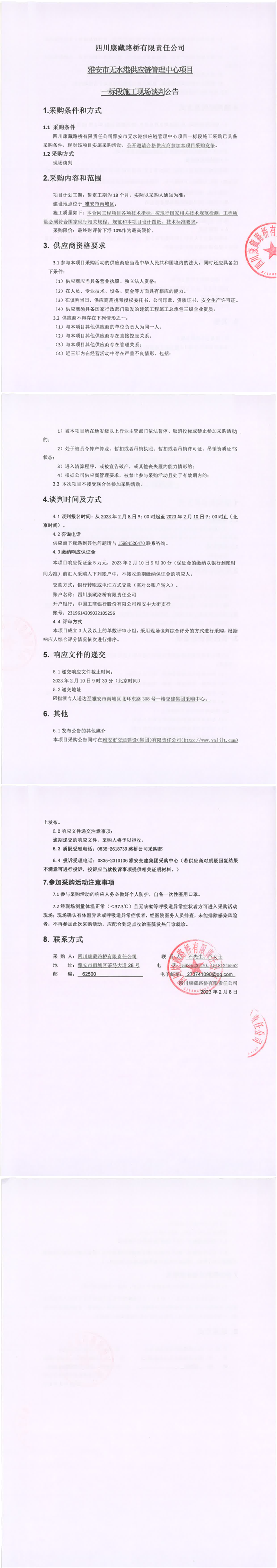 四川康藏路橋有限責(zé)任公司雅安市無水港供應(yīng)鏈管理中心項(xiàng)目一標(biāo)段施工現(xiàn)場(chǎng)談判公告
