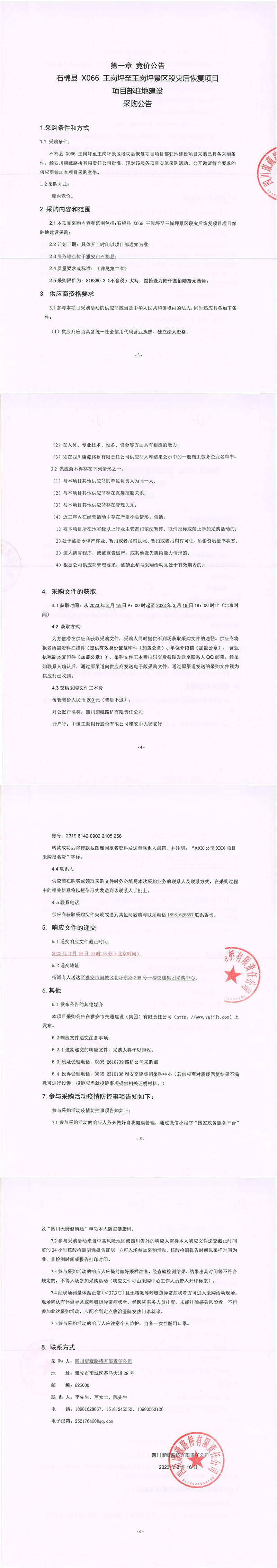 四川康藏路橋有限責(zé)任公司石棉縣X066王崗坪至王崗坪景區(qū)災(zāi)后恢復(fù)項(xiàng)目項(xiàng)目部駐地建設(shè)采購公告