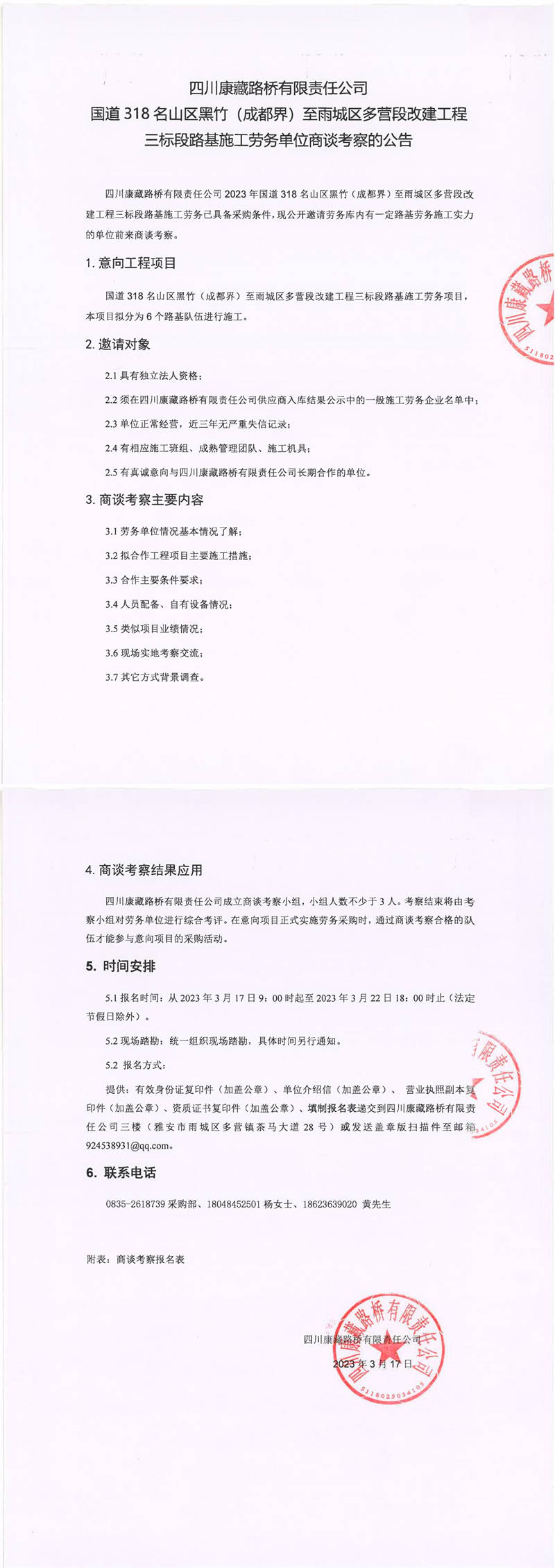 四川康藏路橋有限責(zé)任公司國道318名山區(qū)黑竹(成都界)至雨城區(qū)多營段改建工程三標段路基施工勞務(wù)單位商談考察的公告