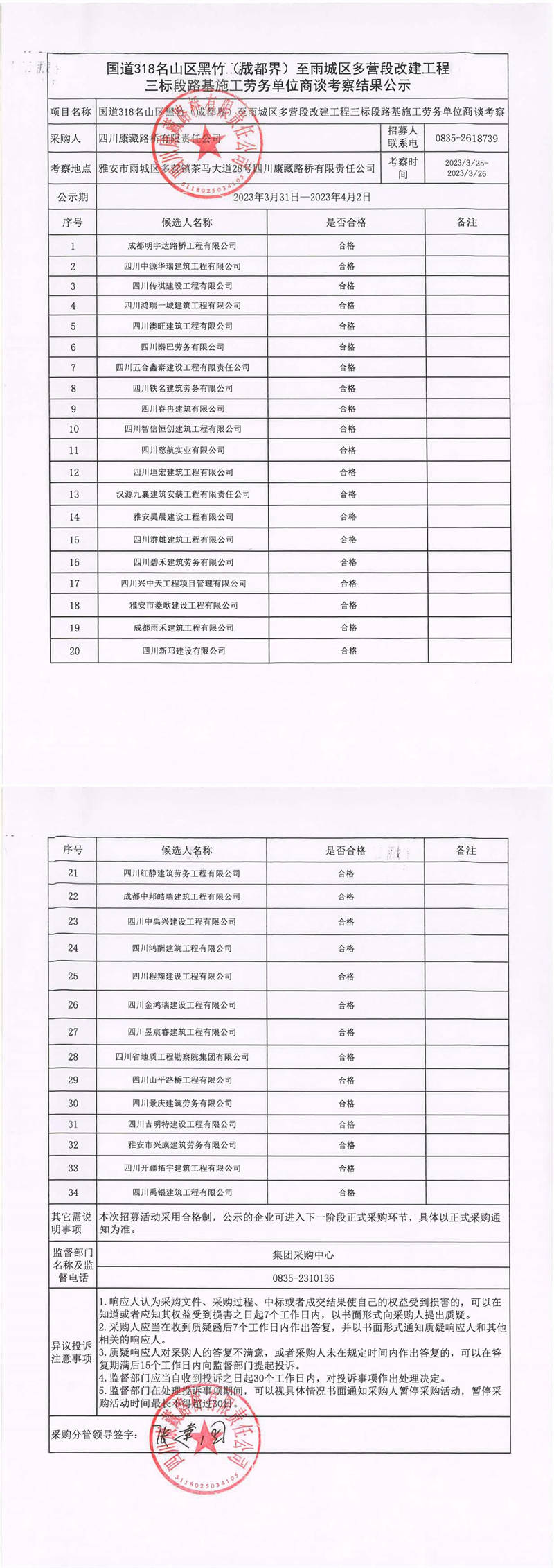 四川康藏路橋有限責(zé)任公司國(guó)道318名山區(qū)黑竹(成都界)至雨城區(qū)多營(yíng)段改建工程三標(biāo)段橋梁施工勞務(wù)單位商談考察結(jié)果公示