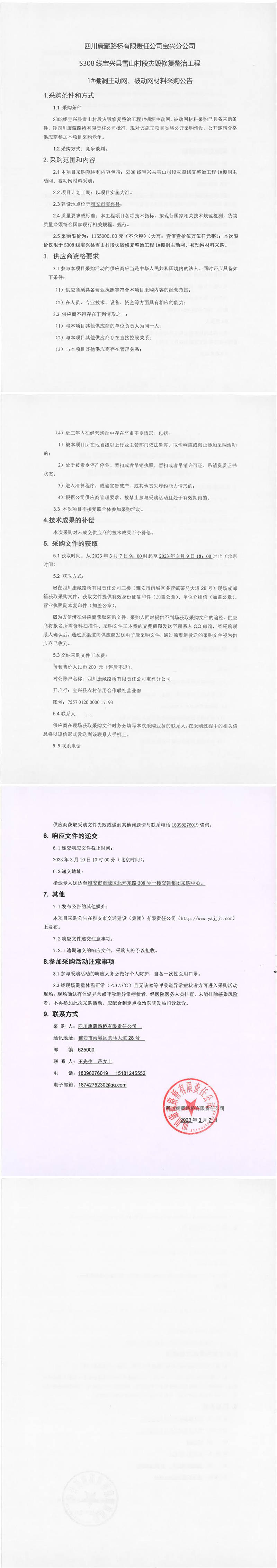 四川康藏路橋有限責(zé)任公司寶興分公司S308線寶興縣雪山村段災(zāi)毀修復(fù)整治工程1#棚洞主動網(wǎng)、被動網(wǎng)材料采購公告