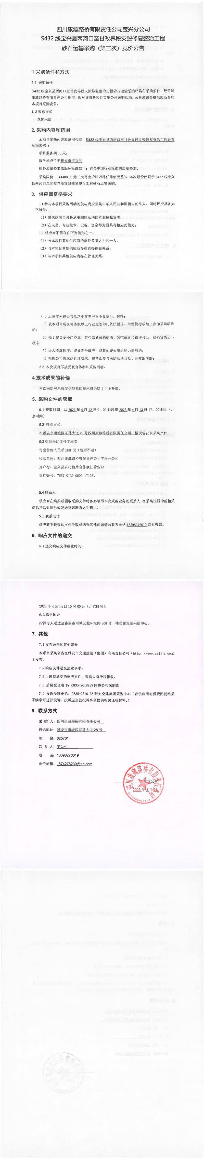 四川康藏路橋有限責(zé)任公司寶興分公司S432寶興縣兩河口至甘孜界段災(zāi)毀修復(fù)整治工程砂石運(yùn)輸采購(第三次)競價公告