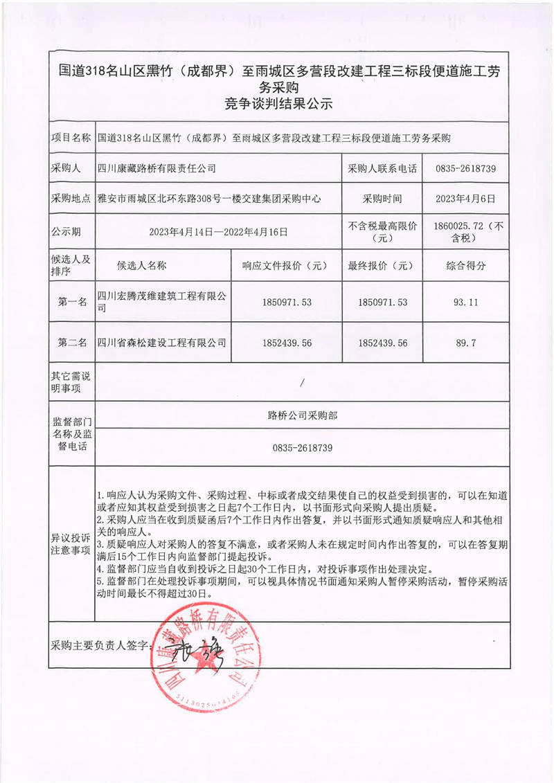 四川康藏路橋有限責(zé)任公司國(guó)道318名山區(qū)黑竹(成都界)至雨城區(qū)多營(yíng)段改建工程三標(biāo)段便道施工勞務(wù)采購結(jié)果公示
