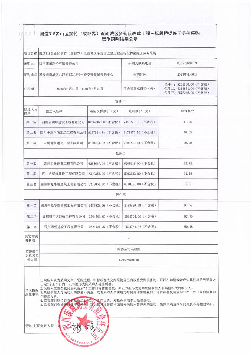 四川康藏路橋有限責(zé)任公司國道318名山區(qū)黑竹(成都界)至雨城區(qū)多營段改建工程三標段橋梁施工勞務(wù)采購競爭談判結(jié)果公示