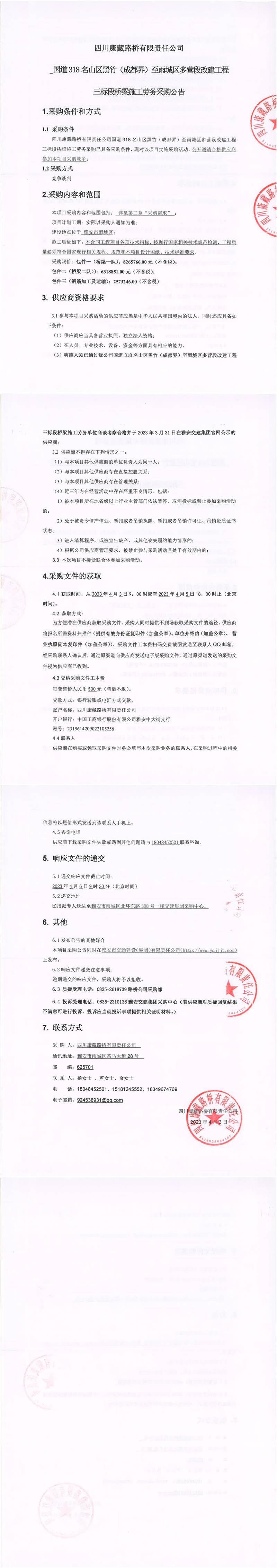四川康藏路橋有限責任公司國道318名山區(qū)黑竹(成都界)至雨城區(qū)多營段改建工程三標段橋梁施工勞務(wù)采購公告