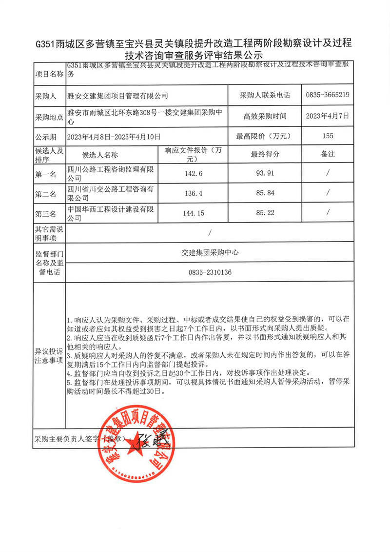 雅安交建集團(tuán)項(xiàng)目管理有限公司G351雨城區(qū)多營鎮(zhèn)至寶興縣靈關(guān)鎮(zhèn)段提升改造工程兩階段勘察設(shè)計(jì)及過程技術(shù)咨詢審查服務(wù)評審結(jié)果公示