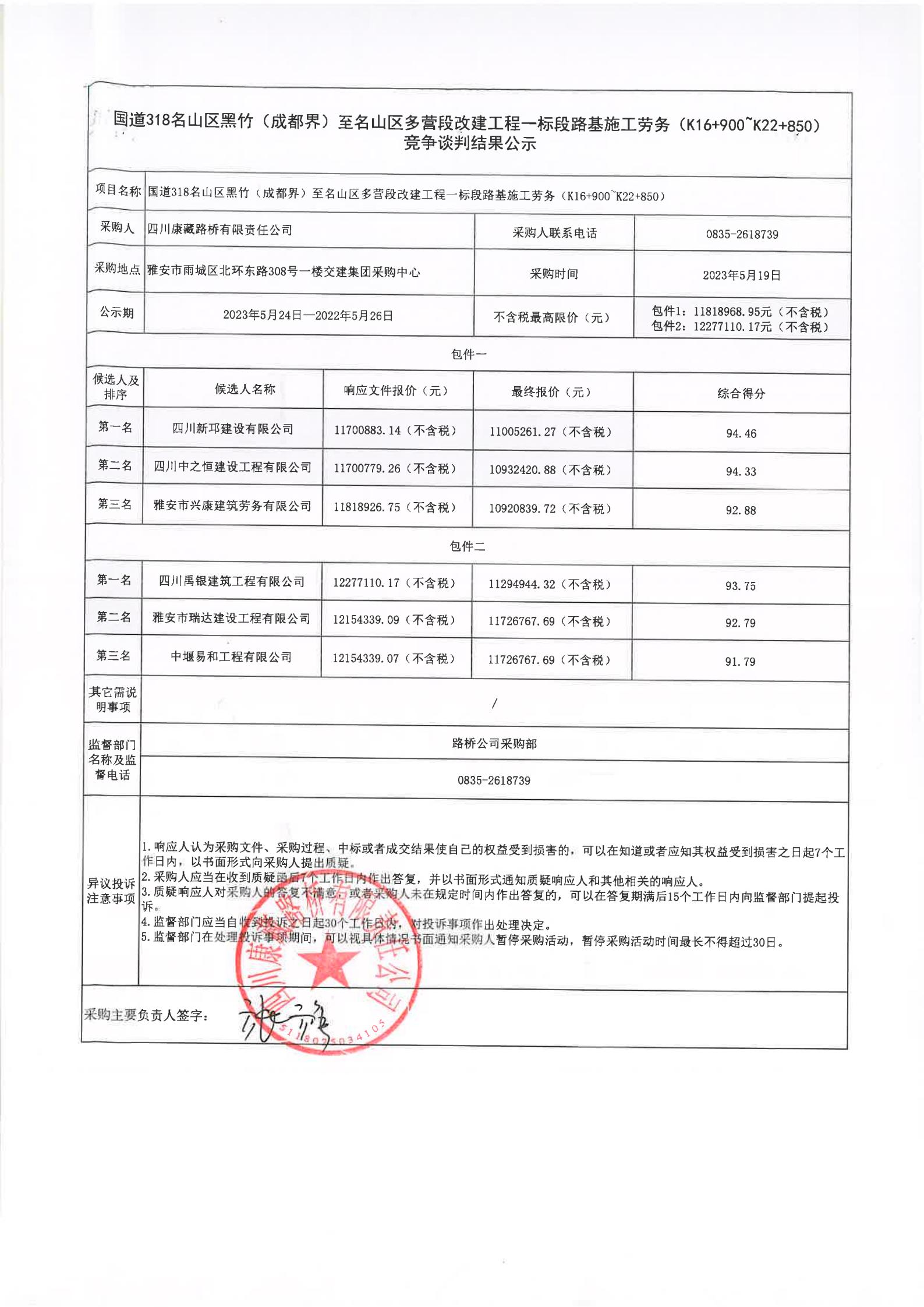 四川康藏路橋有限責(zé)任公司國道318名山區(qū)黑竹(成都界)至雨城區(qū)多營段改建工程一標(biāo)段路基施工勞務(wù)(K16+900~K22+850)競爭談判結(jié)果公示