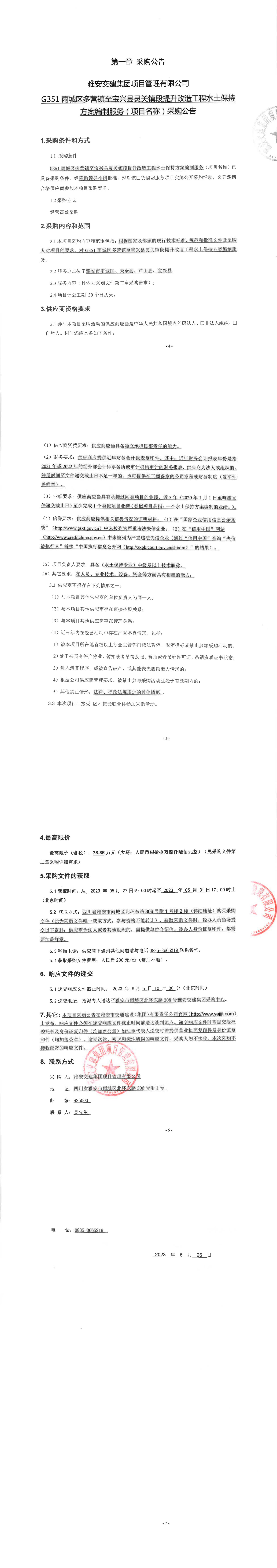 雅安交建集團項目管理有限公司G351雨城區(qū)多營鎮(zhèn)至寶興縣靈關鎮(zhèn)段提升改造工程水土保持方案編制服務(項目名稱)采購公告