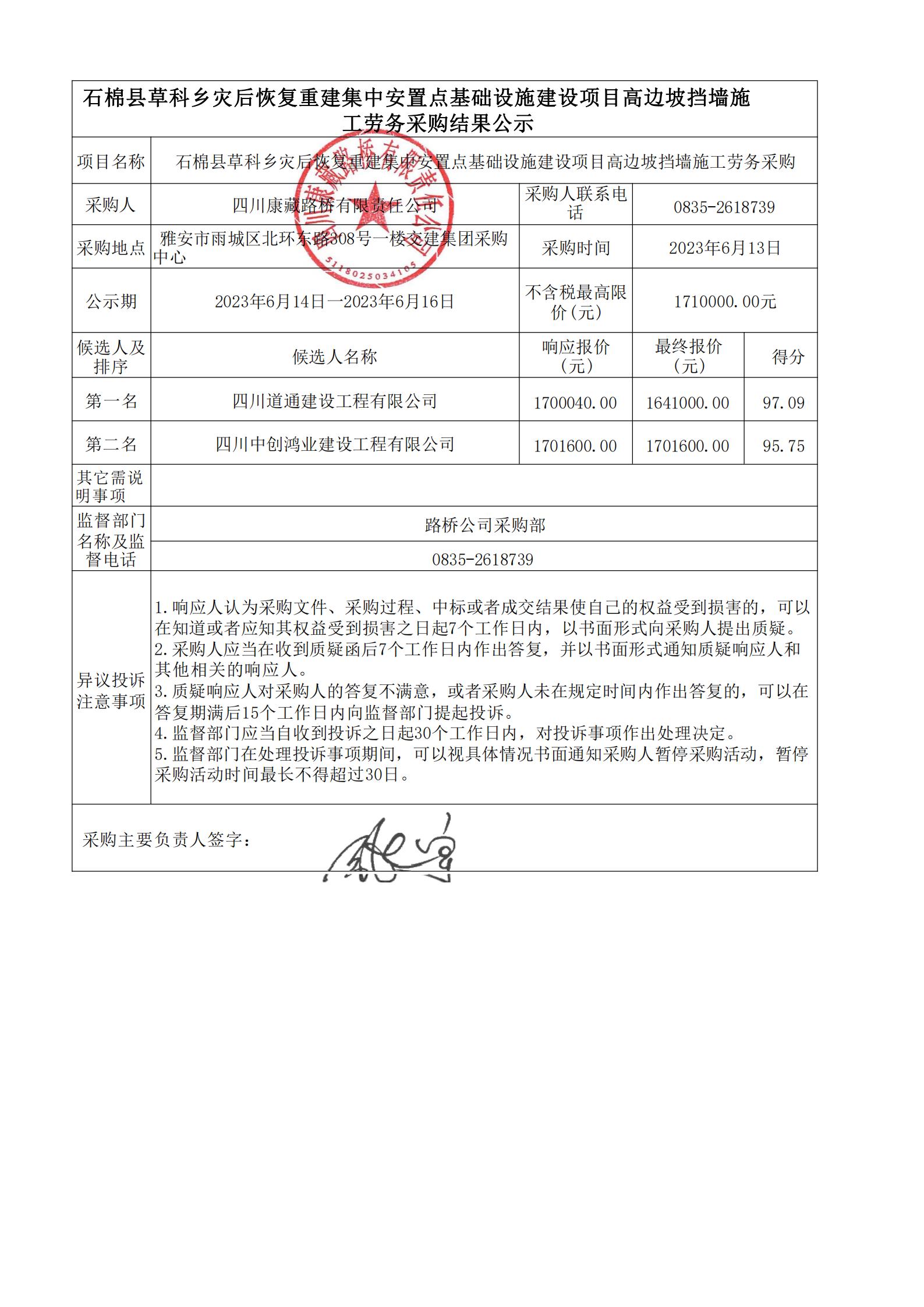 四川康藏路橋有限責任公司石棉縣草科鄉(xiāng)災后恢復重建集中安置點建設項目農(nóng)家村村委會邊坡防護工程施工勞務采購(第三次)結果公示