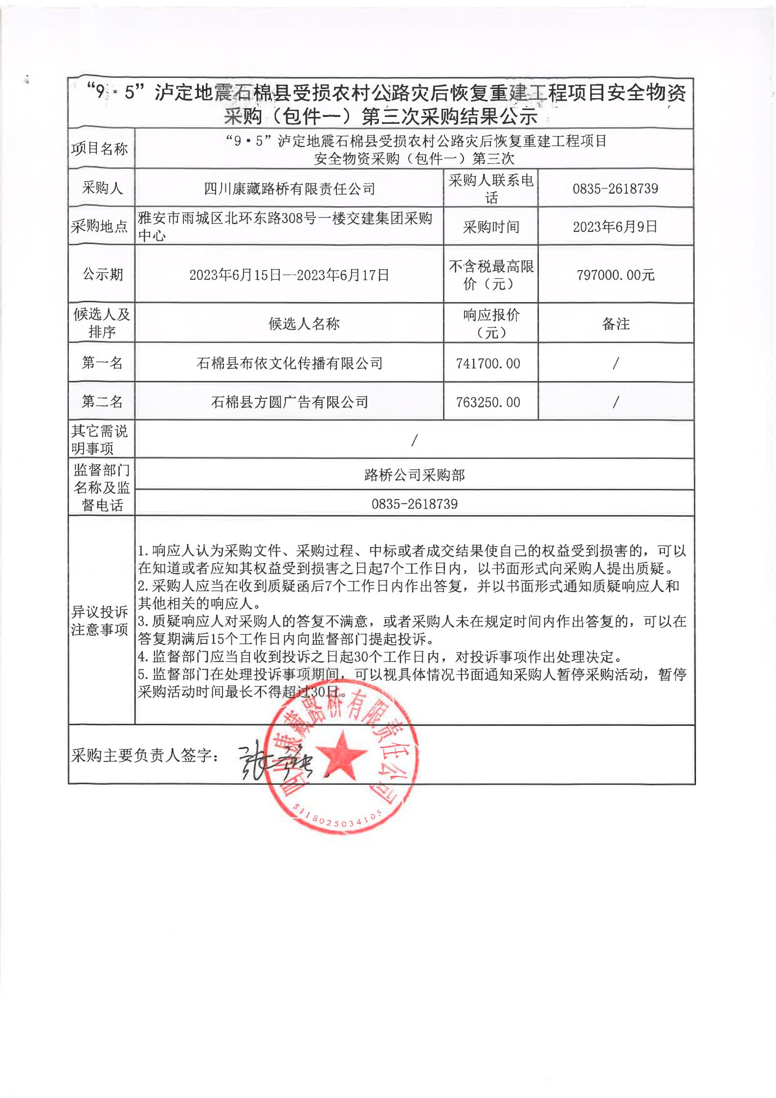 四川康藏路橋有限責任公司“9·5”瀘定地震石棉縣農(nóng)村公路災后恢復重建工程項目安全物資采購(包件一)第三次采購結(jié)果公示