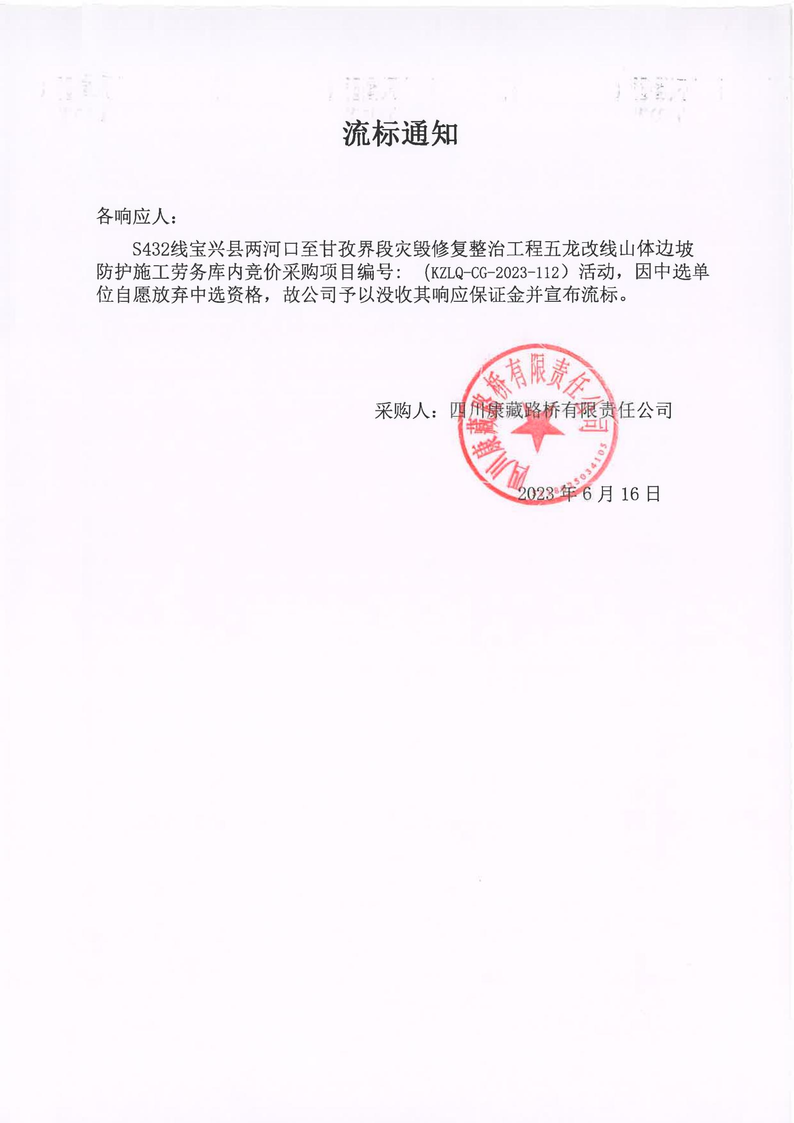 四川康藏路橋有限責任公司S432線寶興縣兩河口至甘孜界段災毀修復整治工程五龍改線山體邊坡防護施工勞務庫內(nèi)競價流標通知