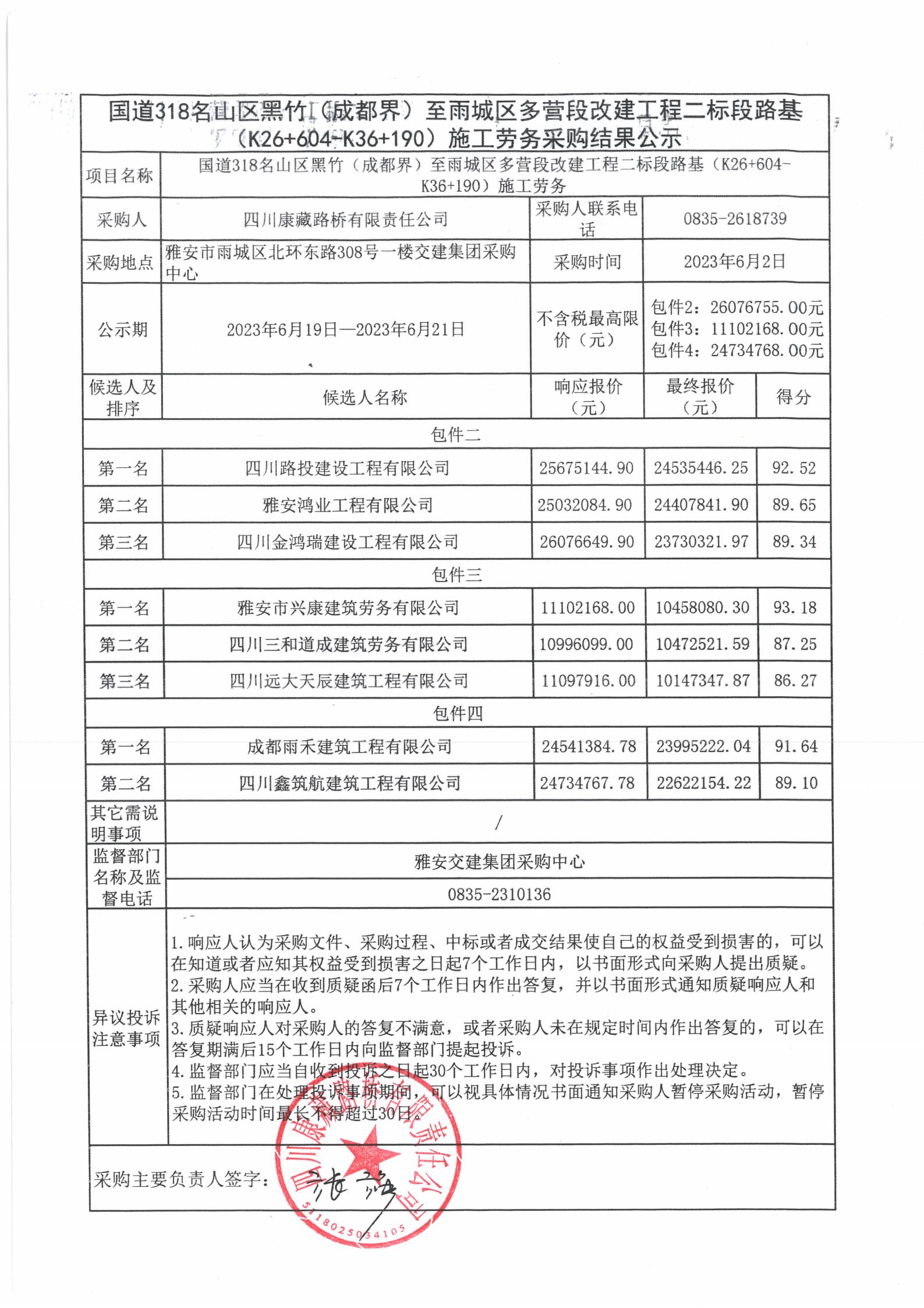 四川康藏路橋有限責(zé)任公司國(guó)道318名山區(qū)黑竹(成都界)至雨城區(qū)多營(yíng)段改建工程二標(biāo)段路基(K26+604-K36+190)施工勞務(wù)采購(gòu)(包件二、包件三、包件四)結(jié)果公示