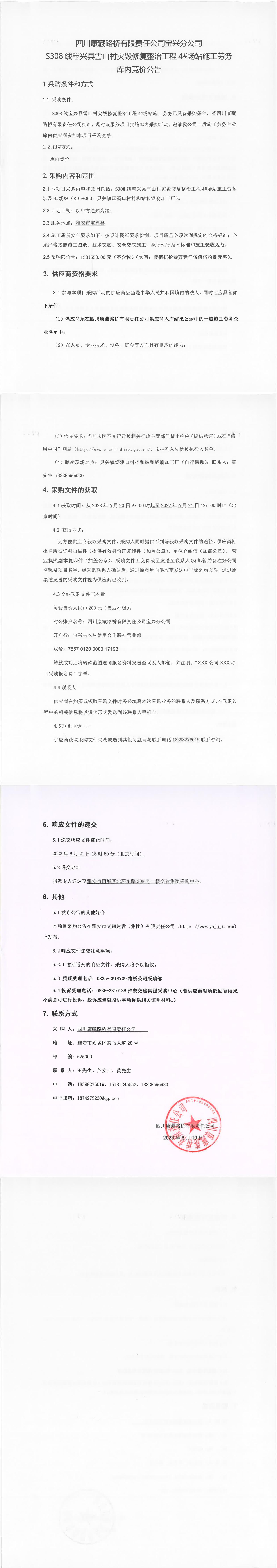 四川康藏路橋有限責任公司寶興分公司S308線寶興縣雪山村災(zāi)毀整治工程4#場站施工勞務(wù)庫內(nèi)競價公告