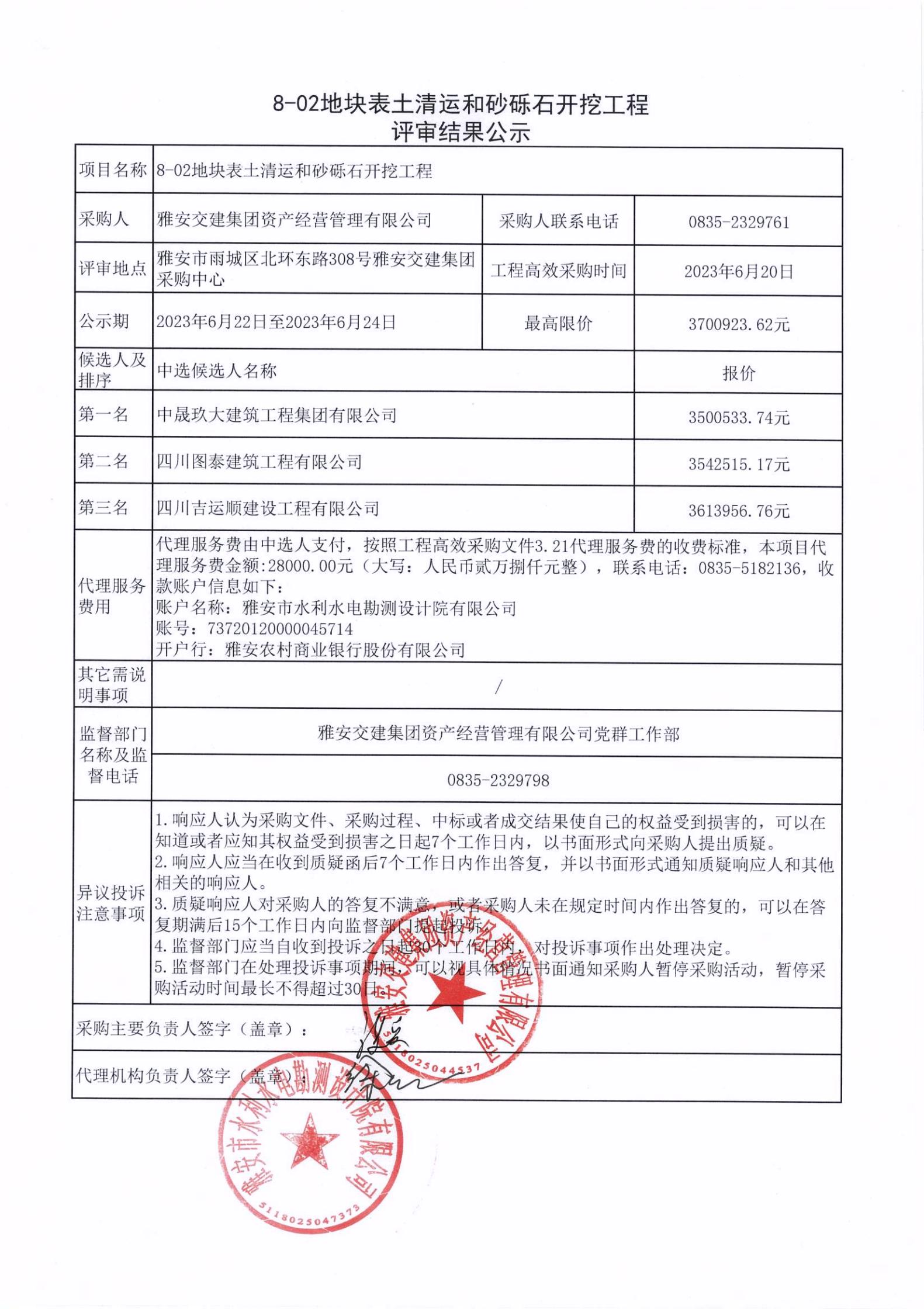 雅安交建集團資產(chǎn)經(jīng)營管理有限公司8-02地塊表土清運和砂礫石開挖工程項目評審結(jié)果公示
